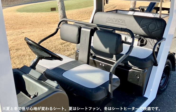 そのような日本独自の気候に適したロイヤルコーチは、エアコンによる冷暖房を完備し、さらにシートファンとシートヒーターも搭載しています。これにより、夏場は涼しく、冬場は温かく快適にラウンドすることが可能です。