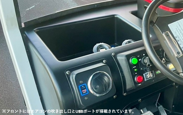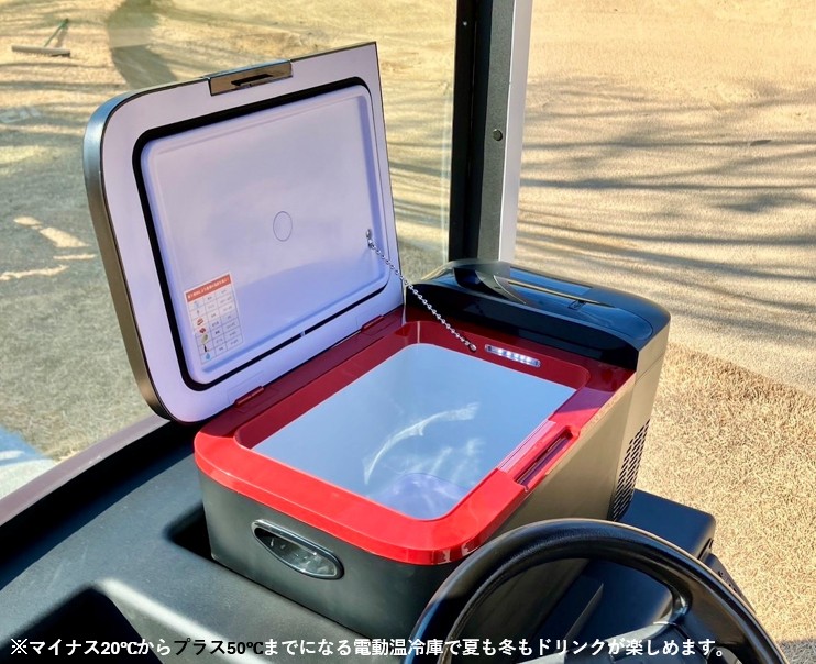 また、カート車内のダッシュボードと一体化した電動温冷庫も備えており、夏場は冷たいドリンクを、冬場は温かいドリンクを楽しむことができます。電動温冷庫はマイナス20℃からプラス50℃の範囲で冷却・加温が可能です。車内にはUSBポートも搭載しているため、ラウンド中の携帯電話などの充電切れを防げます。