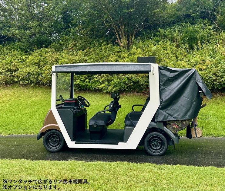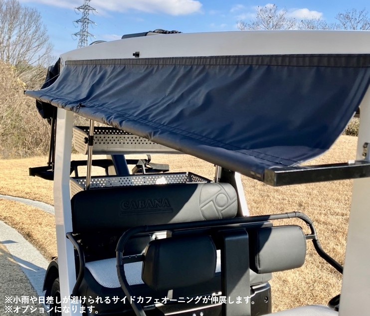 加えて、小雨が降ってきた場合や夏場の厳しい日差しを避けるために、屋根の横にはカフェのようなサイドオーニング(オプション)を搭載しており、小雨や直射日光からプレイヤーを守ることができます。さらに、雨からゴルフバッグを守るリアの雨具(オプション)は、馬車幌のようにワンタッチで広げられ、大切なゴルフクラブを瞬時に雨から保護します。