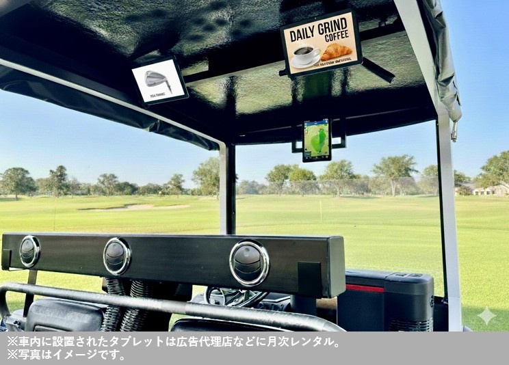車内に設置された大型タブレット端末については、広告代理店様向けに月次レンタルを行い、ゴルフ場という特別な空間での高付加価値な情報発信・広告展開を実現します。