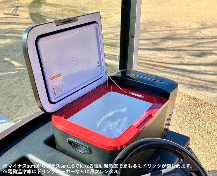 また、カート車内のダッシュボードと一体化した電動温冷庫も備えており、夏場は冷たいドリンクを、冬場は温かいドリンクを楽しむことができます。電動温冷庫はマイナス20℃からプラス50℃の範囲で冷却・加温が可能です。車内にはUSBポートも搭載しているため、ラウンド中の携帯電話などの充電切れを防げます。