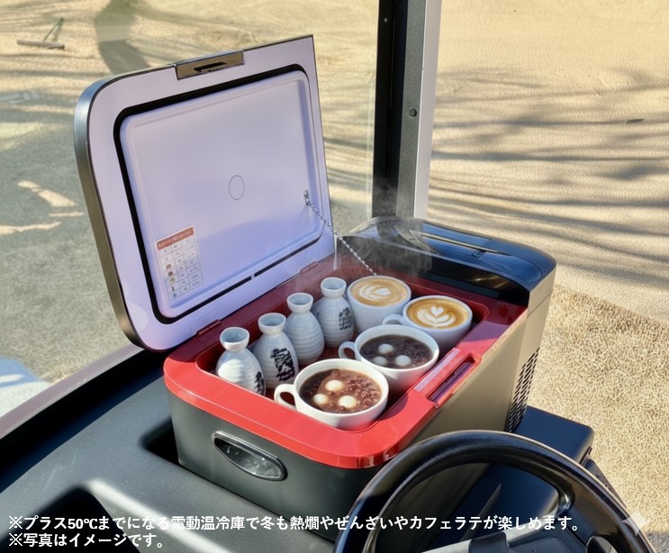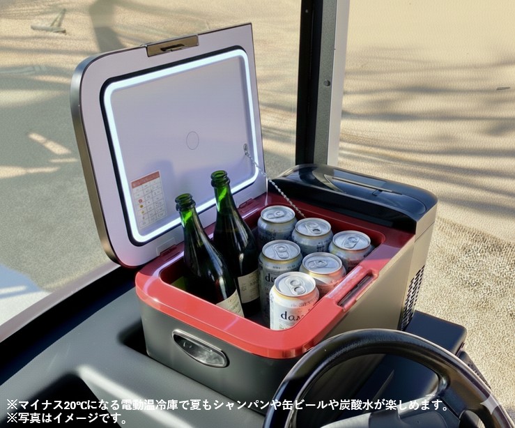 夏は冷蔵庫でキンと冷やしたドリンクを、冬は温庫で温めたドリンクを片手に、ゆったりと景色を眺めながらラウンドができます。商談の場としても、デートの移動空間としても、洗練された時間を提供する特別なカートです。