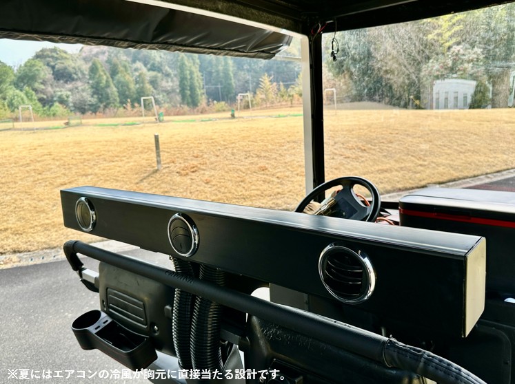 そのような日本独自の気候に適したロイヤルコーチは、エアコンによる冷暖房を完備し、さらにシートファンとシートヒーターも搭載しています。これにより、夏場は涼しく、冬場は温かく快適にラウンドすることが可能です。
